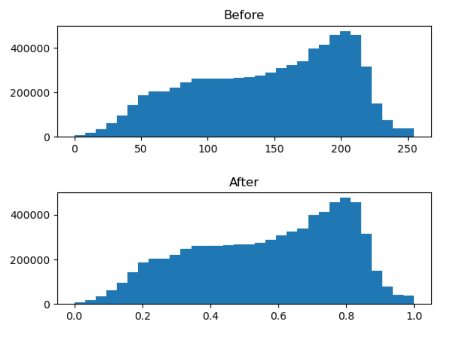 위의 수식을 이용하여 이미지의 최소값이 0, 최대값이 1이 되도록 픽셀 값을 조정합니다.