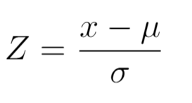 Z-score란 각 값이 평균에서 얼마나 떨어져 있는지를 나타내는 척도로서 Z-score 변환 식은 다음과 같습니다.