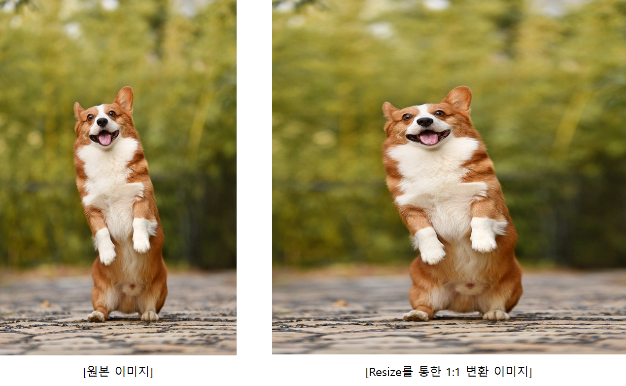 단순하게 Resize 함수를 사용할 수 있지만, 가로와 세로의 비가 1:1이 아닌 이미지를 강제로 1:1로 만들면 이미지가 해당 방향으로 늘어지게 됩니다.