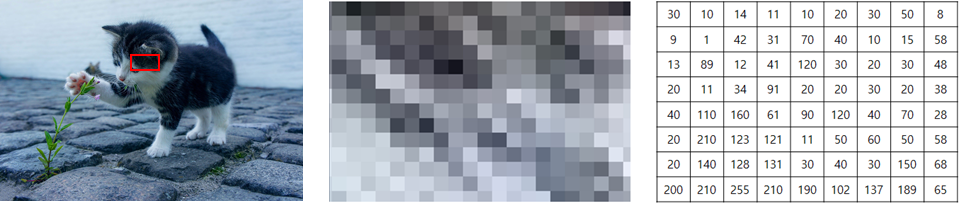 위처럼 각각 값을 가지는 픽셀들이 촘촘히 뭉쳐서 하나의 이미지를 이루고 있는 것입니다.