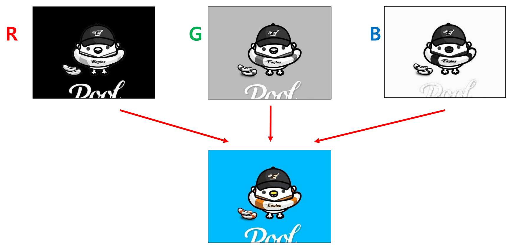 즉, 우리가 보고 있는 color 이미지는 R, G, B 채널이라고 부르는 3개의 Grayscale 이미지의 합으로 이루어져있습니다. 각 채널의 값이 높을수록 해당 색을 많이 포함하고 있습니다.