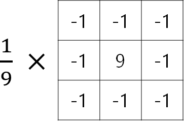 해당 픽셀만 강조하기 위해 주변부의 픽셀의 값을 감소시켜야합니다. 위처럼 강조될 강도를 maks 중앙에 지정하고(9), 주변부의 값을 줄여 총합이 1이 되도록 mask를 생성합니다.